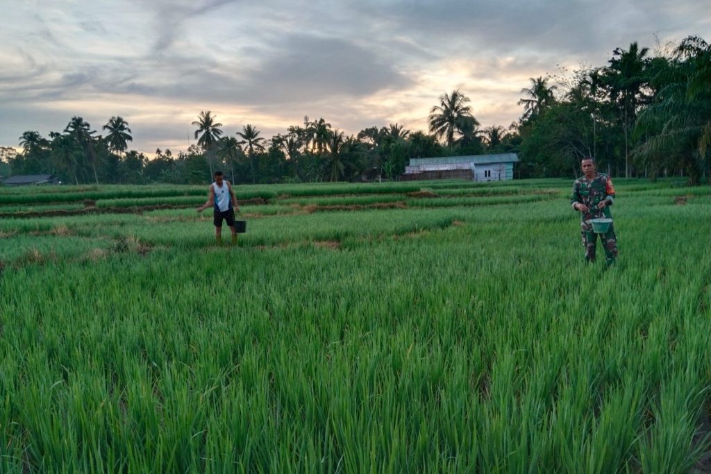 Personil Kodim 0203/Langkat Babinsa Koramil 06/Bahorok Serka Tengku Ibrahim, Jaga Kesuburan Padi, Babinsa Bantu Petani Tebarkan Pupuk di Desa Timbang Lawan