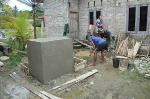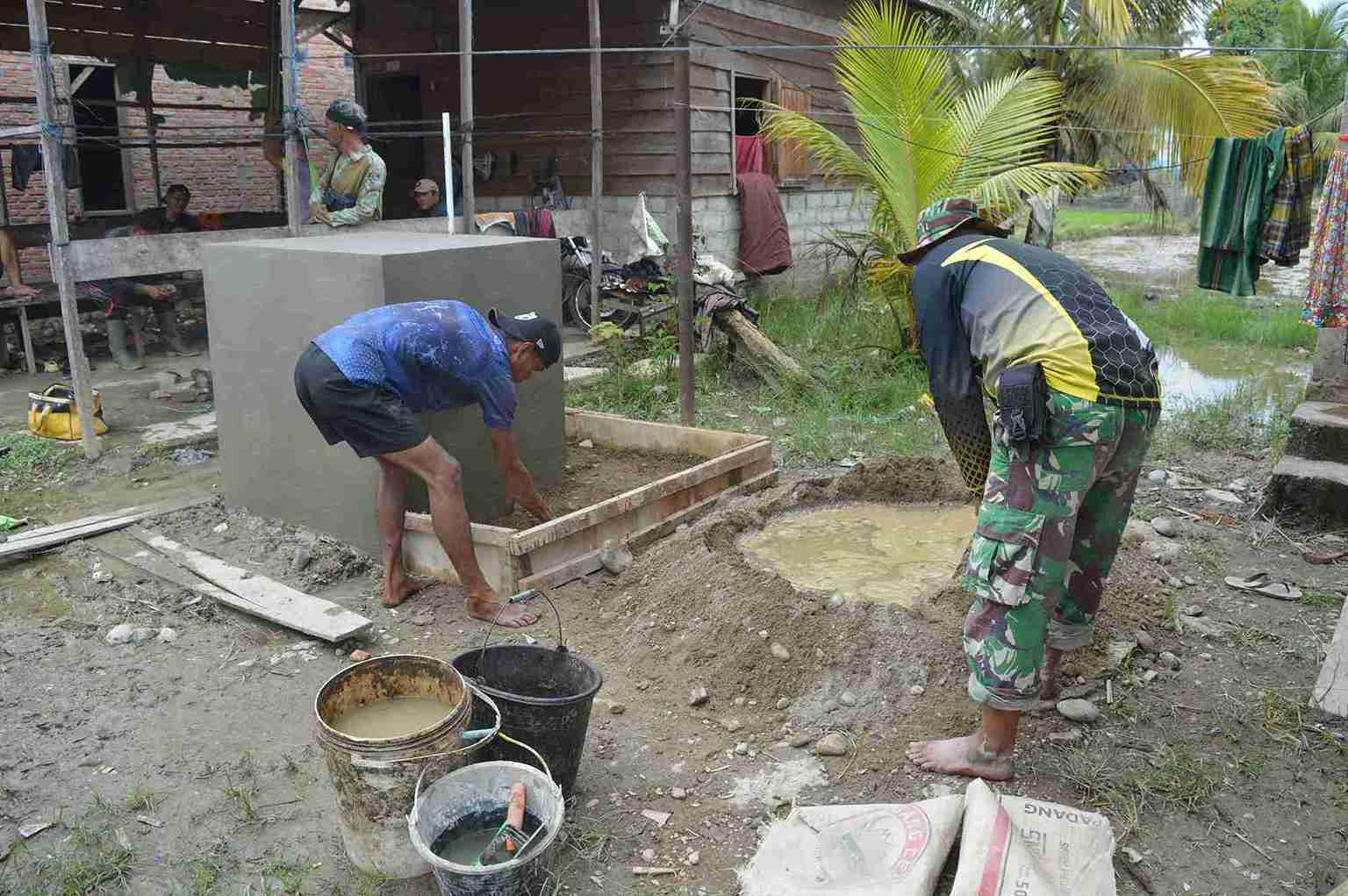 Salah satu sasaran program yang tengah di kebut adalah pembangunan sumur bor, di mana para personel bersama warga setempat melaksanakan pengecoran lantai untuk memastikan progres berjalan sesuai target