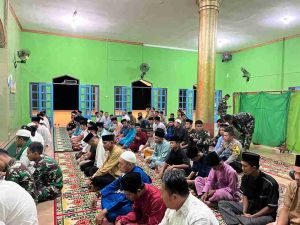 NATUNA, Cinta Rakyat – Bulan ramadhan penuh berkah di manfaatkan personel Satgas TMMD 123 Kodim 0318/Natuna untuk memperkuat keimanan dan ketaqwaan kepada Allah SWT dengan melaksanakan buka puasa bersama dan Sholat Tarawih bersama warga masyarakat di Masjid Al Babussalam di Desa Selemam, Kecamatan Bunguran Timur Laut, Kabupaten Natuna, Jumat 14 Maret 2025.