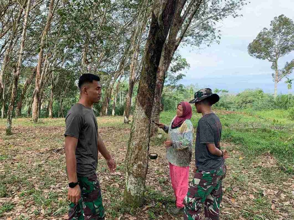 Meski Sibuk Kerjakan Program TMMD 123 Kodim 0203/Lkt, Pratu Nadra Bantu Bu Tuti Deres Getah Karet